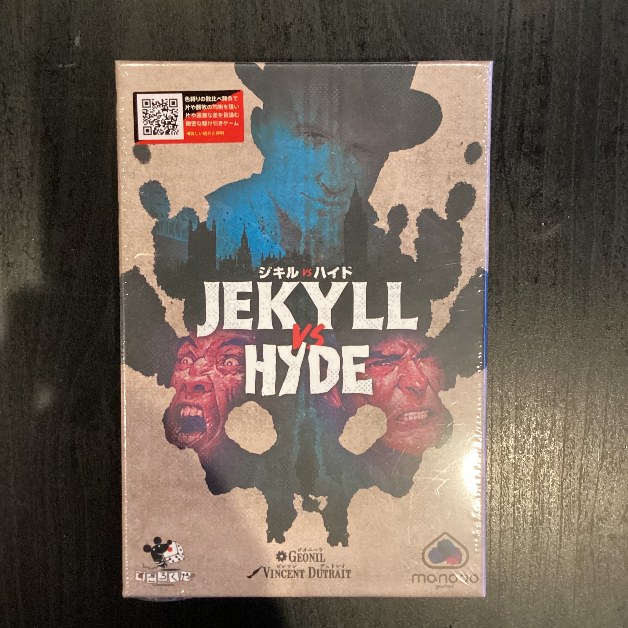 『ジキルvs(バーサス) ハイド』は、人間の善悪を題材にした有名な怪奇小説『ジキル博士とハイド氏』がテーマの、2人専用の緻密な駆け引きゲームです。ジキル役とハイド役に分かれて、手札から出すカードの強弱対決をする中で、ジキルは穏当に勝敗差を埋めようとし、ハイドは過激に勝敗差を広げようと目論みます。