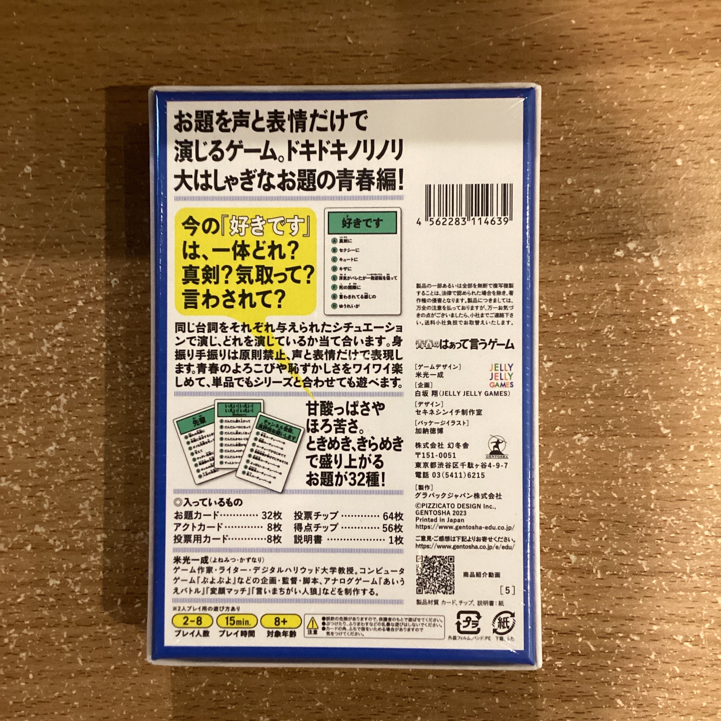各プレイヤーは共通の台詞を与えられたシチュエーションで演じ、他のプレイヤーはそれぞれ何を演じているかを当てます。身振り手振りは禁止、声と表情だけで表現しましょう。大盛り上がりのコミュニケーションゲームです。