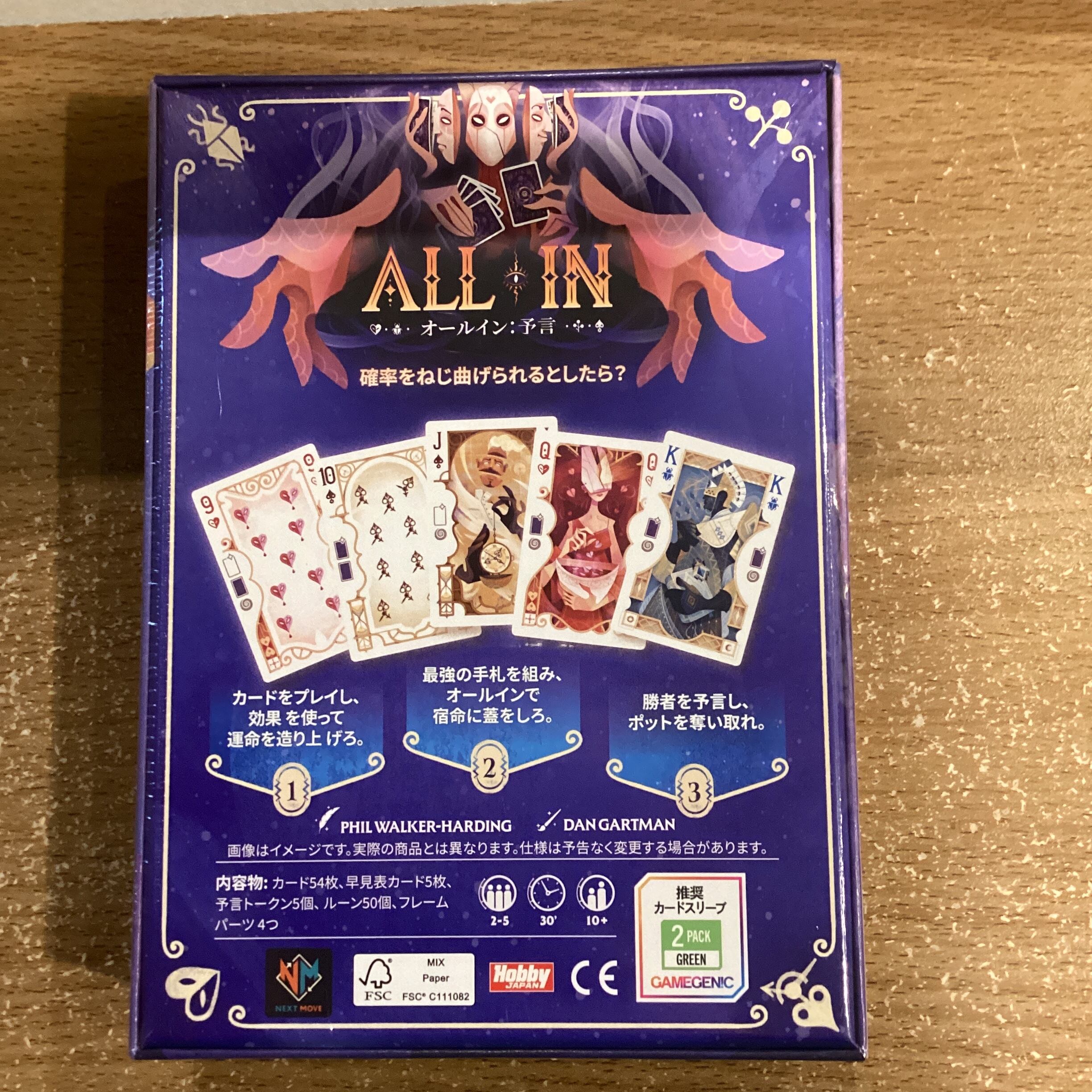 『オールイン:予言』は、基礎は伝統ゲームであるポーカーでありながら、カードプレイによる手札の変遷管理や、ディスプレイとカードプレイから他のプレイヤーの手札を予想するという要素により、新感覚のゲームとなっています!